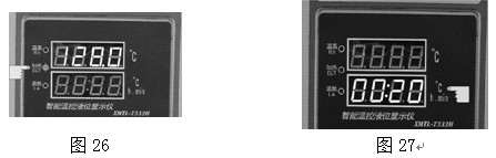① 當溫度、時間設定完畢,控制面板上的加熱燈亮(圖26),滅菌器正常加熱升溫(升壓)。當滅菌室內達到設定溫度時,加熱燈間斷閃爍,進入滅菌倒計時,并在控制面板上的設定窗內(圖27)顯示出剩余滅菌時間。
