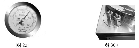 ④ 當采用人工控制,將控制面板上的溫度設定**129℃,滅菌器壓力(溫度)將有安全閥泄壓,自動計時無效,須人工控制滅菌時間。安全閥**高工作壓力為0.178 Mpa+0.014MPa(圖29)中箭頭所示。在使用中應經常檢查安全閥起跳靈活性及可靠性(圖30),安全閥每年**少應校驗一次。當壓力超出**高工作壓力0.178Mpa+0.014Mpa時,應立即更換合格的安全閥,否則導致鍋內壓力超壓,造成暴裂事故。