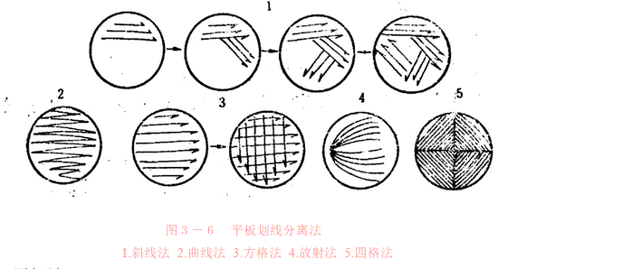 2)三點接種 在研討霉菌形狀經常用此法。此法即把少數的微生物接種在平板外表上,成等邊三角形的三點,讓它各自獨立構成菌落后,來調查、研討它們的形狀。除三點外,也有一點或多點進行接種的。