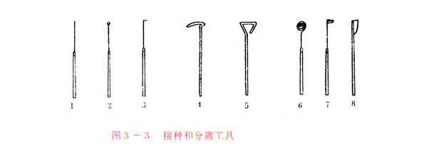 1.接種針 2.接種環 3.接種鉤 4.5.玻璃涂棒 6.接種圈 7.接種鋤 8.小解剖刀