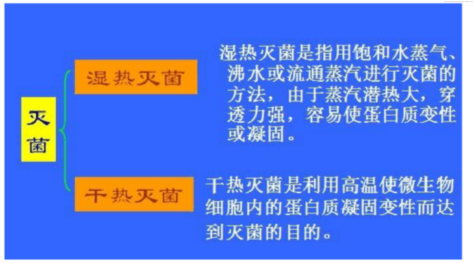 壓力:100KPa,水蒸氣的溫度:115℃,時間:20min,可殺死各種微生物和它們的孢子 壓力:147KPa,水蒸氣的溫度:121℃,時間:15~30min ,各種微生物和它們的孢子或芽孢